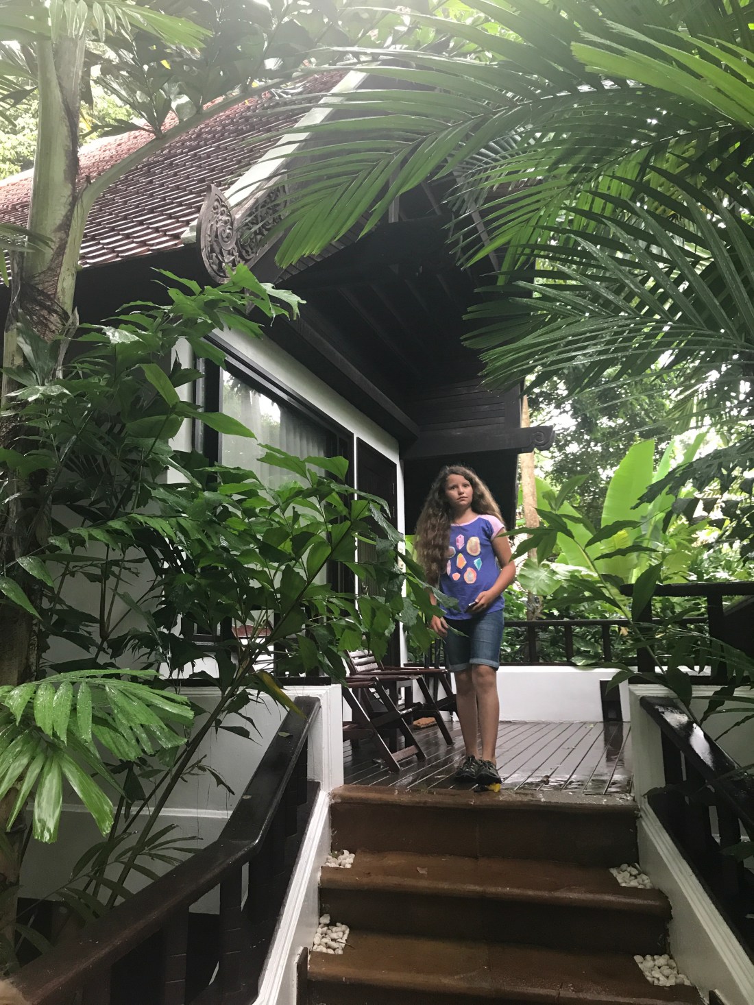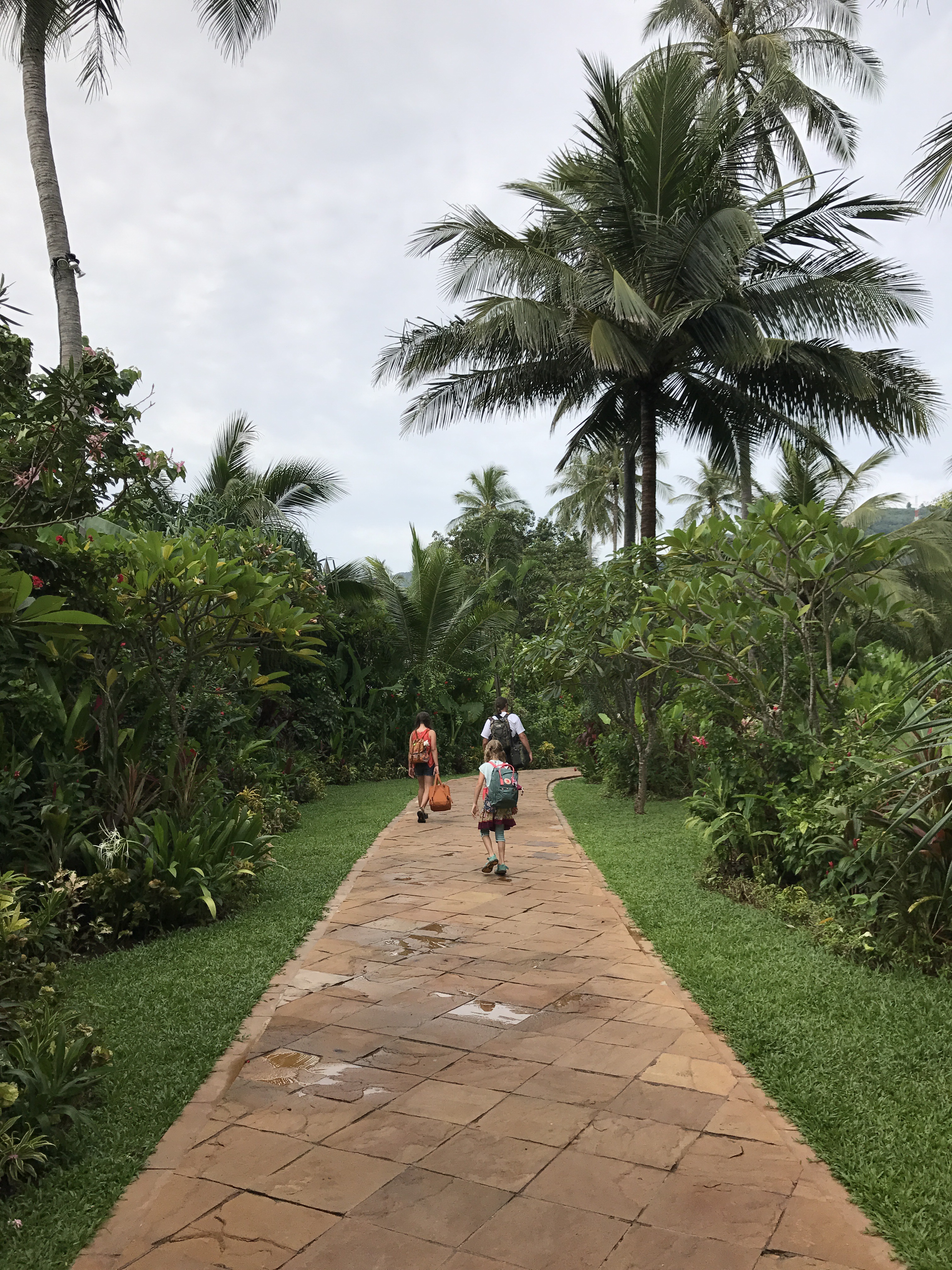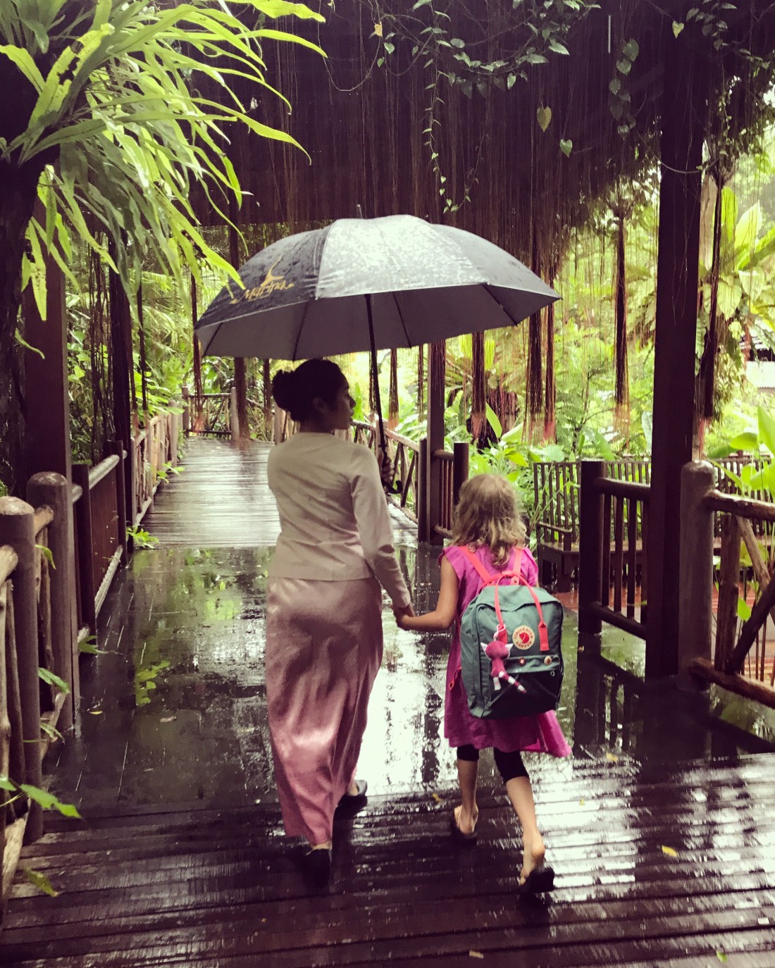It was raining the day we arrived, so Georgia got a hand-held, umbrella escort to our hut from the woman checking us in.